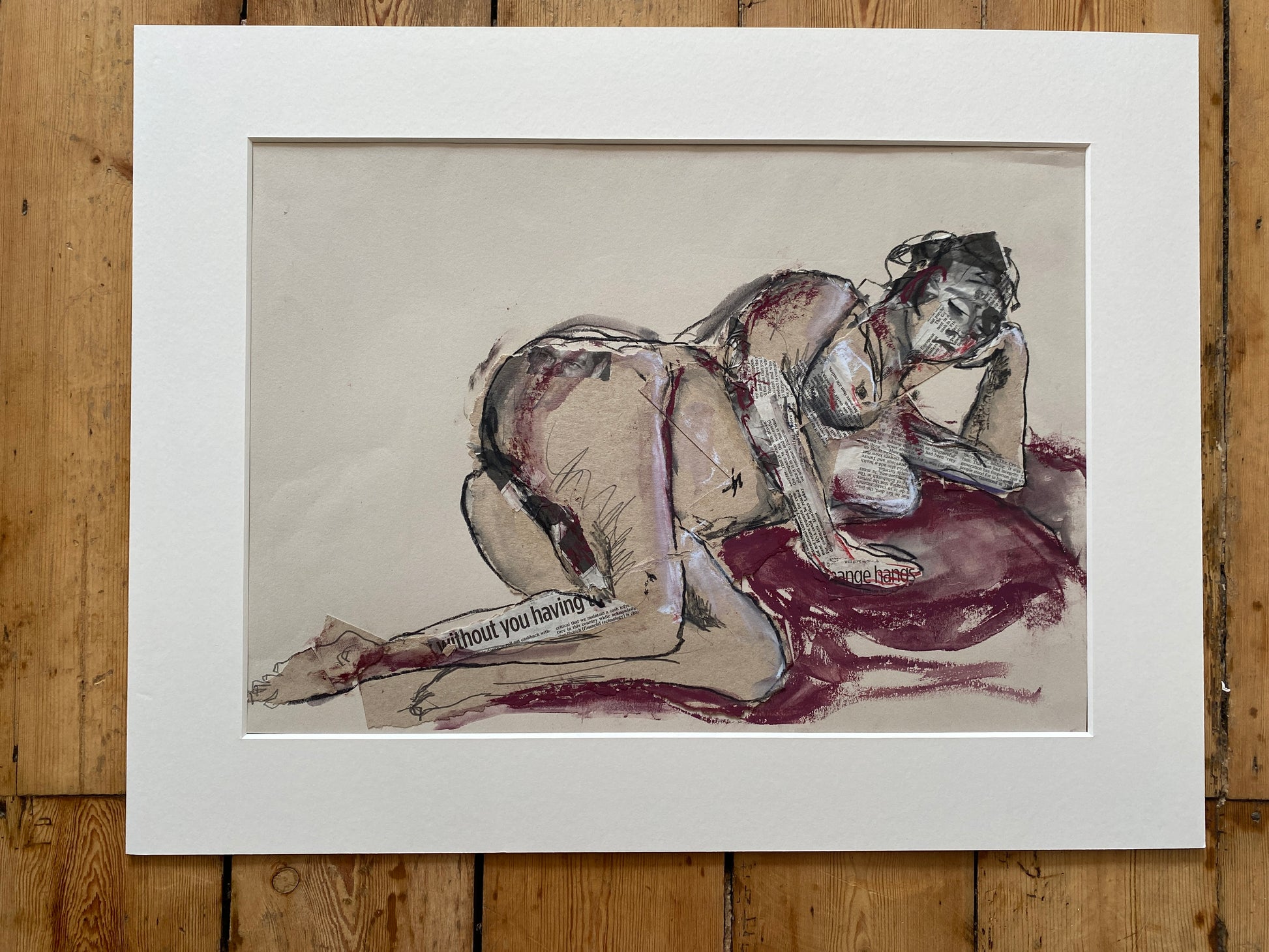 Life drawing study using newspaper words as a reflection point.